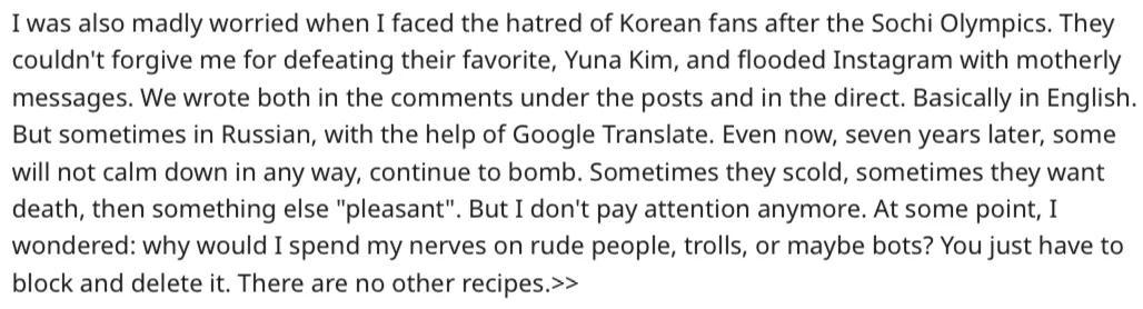 “在索契奥运会之后,当我面对韩国粉丝的仇恨时,我感到非常担心。他们无法原谅我击败他们的明星金妍儿(Yuna Kim)。