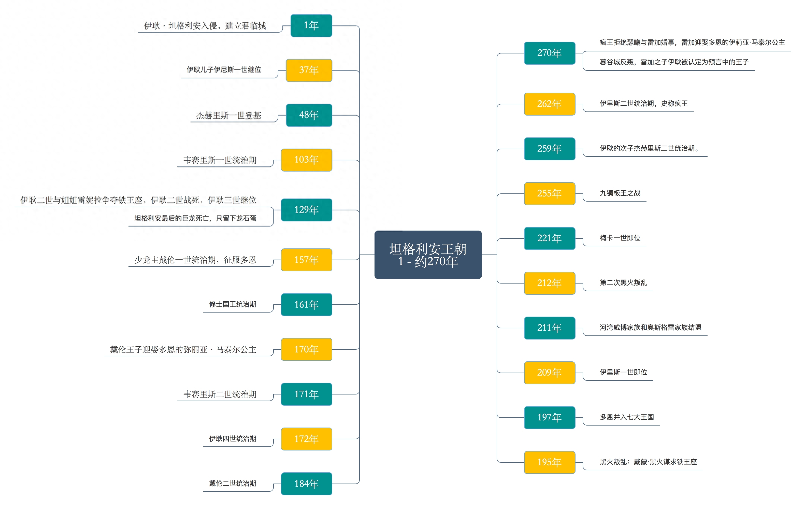 由于坦格利安家族在整个《权力的游戏》故事中的重要性,关于坦格利安王朝的大事记,本人整理了一张比较详细的事记图,供大家参考。