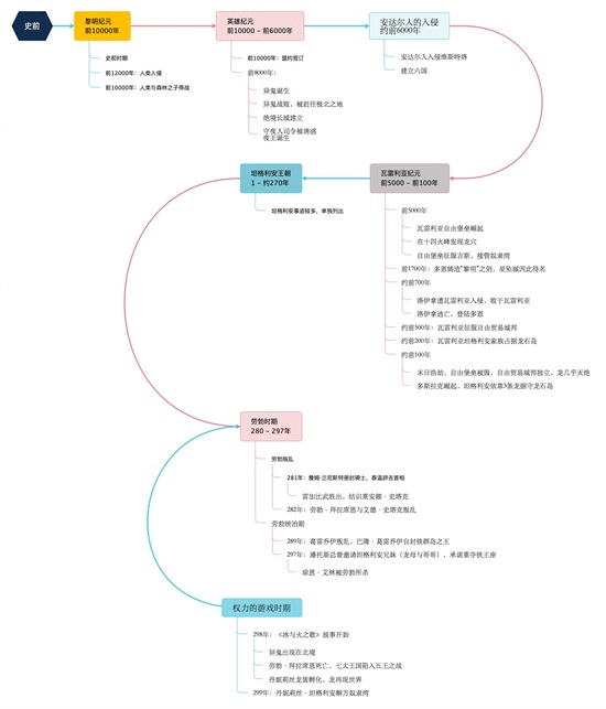 后记:《权力的游戏》是《冰与火之歌》系列小说中的第一部。故事主要发生在维斯特洛大陆,维斯特洛也被称为日落国度,以中世纪的欧洲大陆为主要背景。从史前到权力的游戏时期,比较重要的故事节点整理如下,其中坦格利安王朝的事记参考图八。