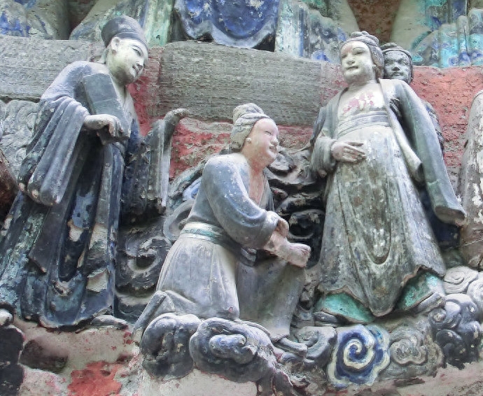 这种竖式分娩,可以在重庆大足中看到。在“临产受苦恩”石刻中,孕妇背后站着一妇,前面半蹲着的接生婆正扎衣卷袖准备接生。这组石刻开凿于南宋,是研究古代孕妇分娩方式的重要资料,我在2014年6月曾专程去看了。