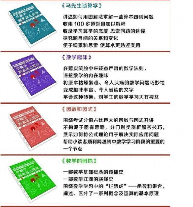 有需要的家长,可以帮助自己的孩子买一套《数学四书》,它包括《数学趣味》《马先生谈算学》《数学的园地》和《因数和因式》,只需79元,非常划算。