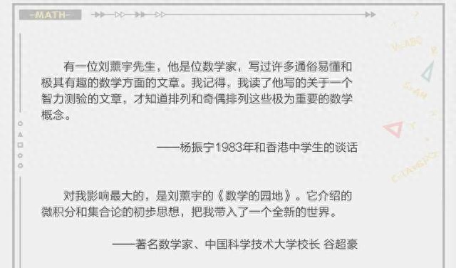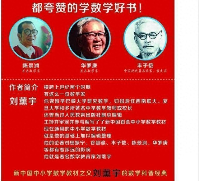 当然,我们也可以通过阅读很多经典的数学科普著作,比如杨振宁、谷超豪等人推崇,陈景润、华罗庚等大数学家点选的《数学四书》,它来自民国数学家刘薰宇之手。