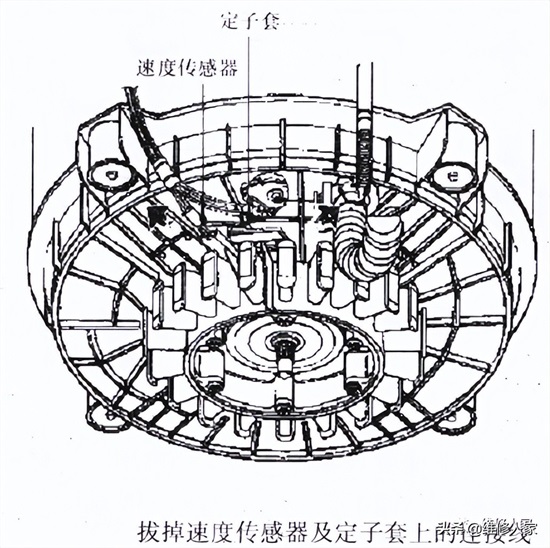 按箭头方向拔掉速度传感器及定子套上的连接线,拧下定子上的6个固定螺钉,用手托住定子,再拧下最后1个螺钉,即可取下定子。