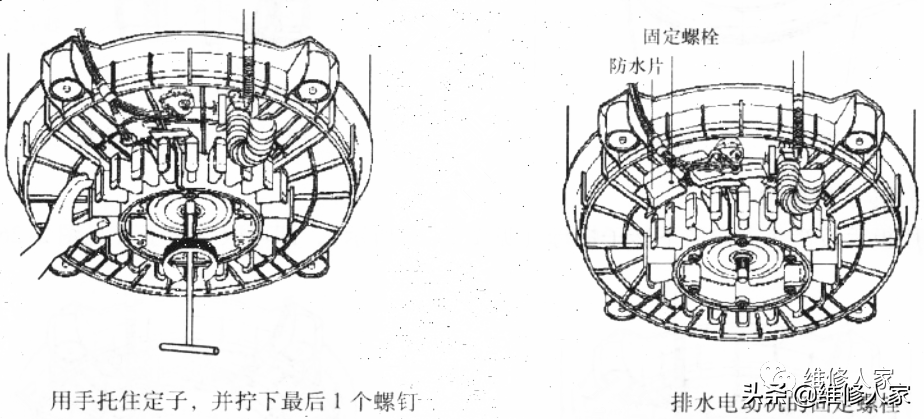 拔下排水电动机的连接线束,拧松固定螺栓,即可取下防水片及排水电动机。