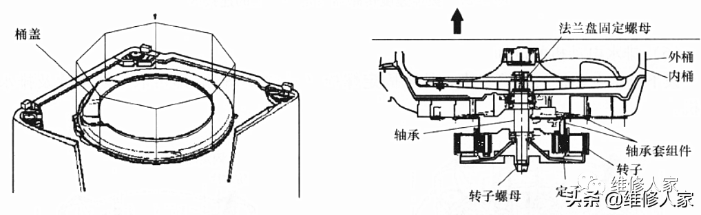 拧下桶盖上的8个螺钉,取下桶盖。再用一字螺钉旋具取下内桶帽组件,拧下法兰盘螺母与法兰盘弹簧垫片,向上提出内桶即可。