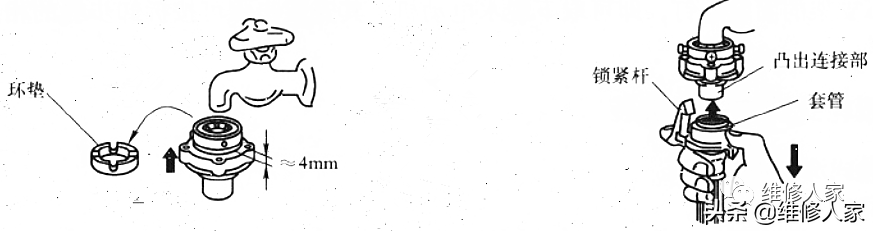若水龙头的直径大于接头环垫的内径,可松开万能接头上的4个螺钉,并将接头环垫从万能接头内取出,如图所示。