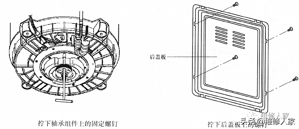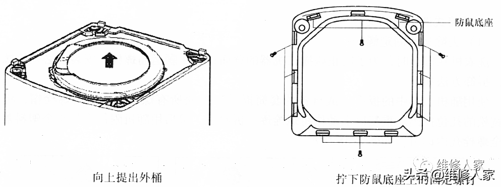 拧下后盖板上的螺钉,取下后盖板,拔下所有连接线束,并拔下压力开关导管及接插件。取下顶盖,按箭头方向将外箱体中的减振吊杆及外桶向上提,再拧下防鼠底座上的固定螺钉即可。