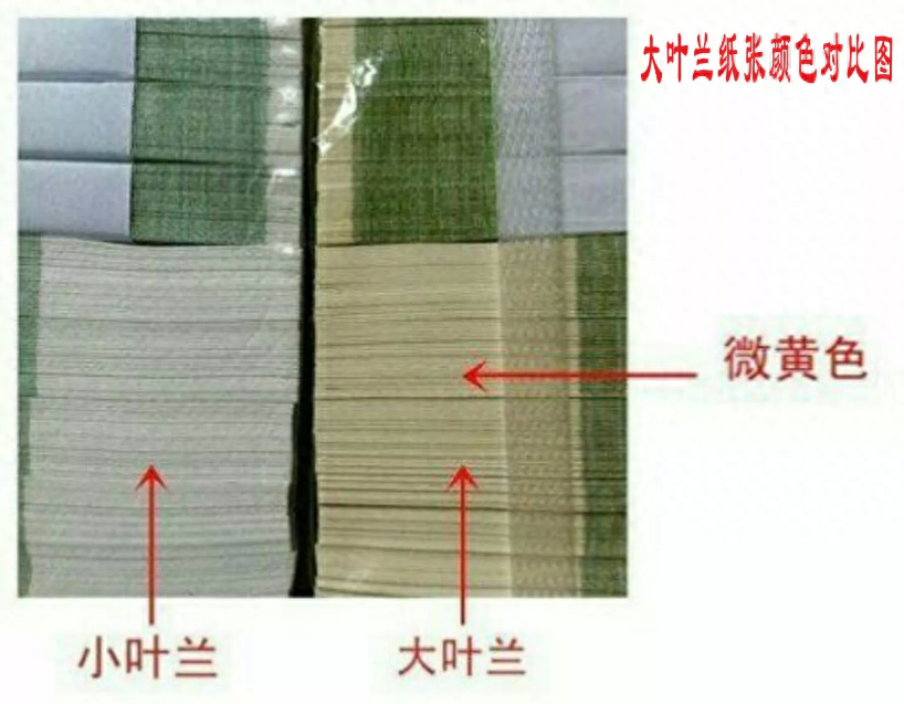 1. 大叶兰水印是凸版印刷,用手触摸水印处有会感觉到明显的凹凸感,小叶兰没有凹凸感;