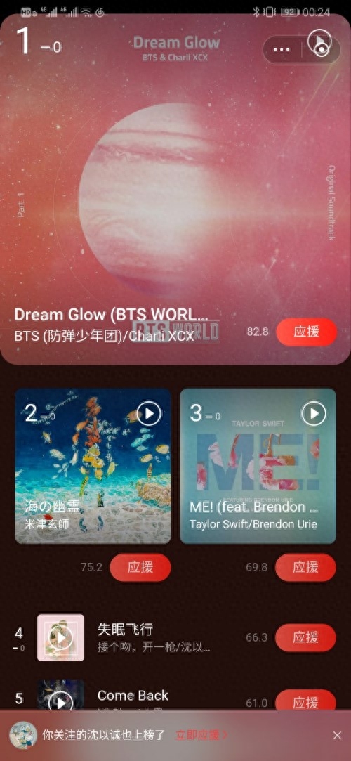 沈以诚新歌在网易云音乐人气榜快速上升到第4位