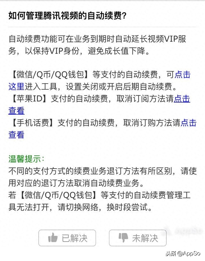 如果怕自己到时间后忘了取消被「反薅」,你大可以在支付后立即「翻脸」。以腾讯视频为例,在「个人中心」-「我的 VIP 会员」中找到「管理自动续费」,根据续约方式进入对应的界面,即可关闭自动续费。其他平台的操作也大同小异。关闭自动续约不会影响当前的会员状态。
