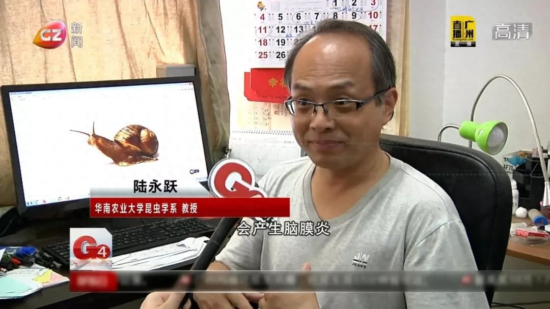 华南农业大学昆虫学系陆永跃:“这种大蜗牛(携带着)很多线虫,其中一种人感染后能产生脑膜炎,它对我们人体健康影响非常大,所以建议大人跟小朋友第一不要接触它, 远离它;第二,千万不要拿它来吃。”
