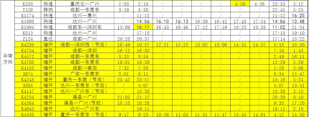 成都—深圳西(节后)K4288,成都—深圳K4734,成都—东莞东K4572、K4708,成都—衡阳K4182,广安—东莞东3674,重庆—东莞(节后)K4248,达州—东莞东(节后)3805,达州—广州东(节后)K4147,渠县—广州K4234,渠县—广州(节前)K4564,达州—广州东K4645,重庆—东莞东(节后)K4438。