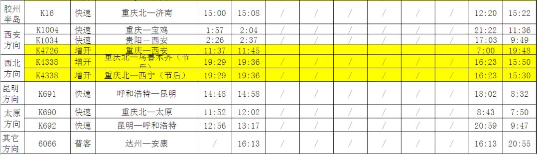 西安增开重庆—西安K4726,西北增开2趟分别为重庆北—乌鲁木齐(节后)K4338,重庆北—西宁(节后)K4338。