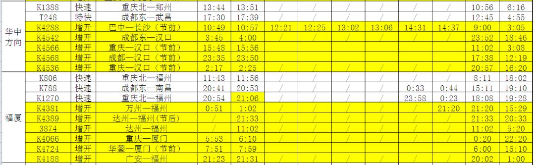 万州—福州K4381,达州—福州(节后)K4389,达州—福州3874,重庆—厦门K4066,华蓥—厦门(节前)K4724,广安—福州K4188。