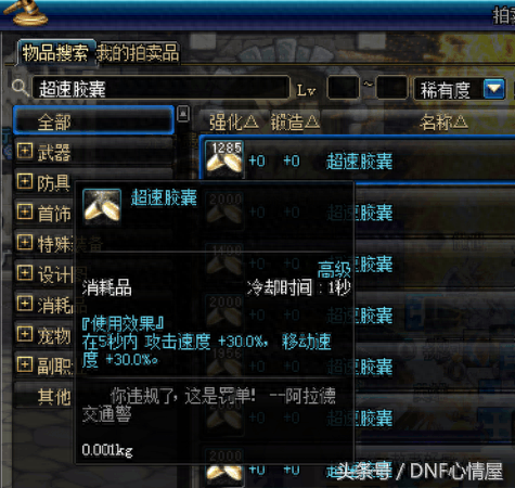 超速胶囊这是DNF中竞速比较给力的药剂,能在5秒内攻击速度+30%,移动速度+30%,可以说这个药剂不仅对于竞速玩家,对于需要攻速和移速的职业,这药剂绝对不可缺少。而超速胶囊据说将要绝版,绝版后超速胶囊将无法获得,所以旭旭宝宝开始慌了,横扫山东一区超速胶囊。