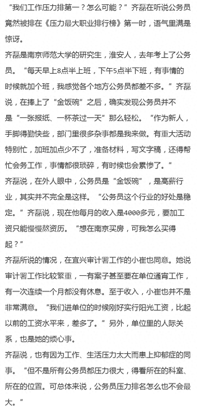 该课题组统计发现,压力分数从高到低依次是:管理中层为80分;经理层为75分;教职员工为75分;一般管理技术人员为72分;医务工作者为68分;社区人员为68分;下岗人员为68分;矿工为60分;一般企业工人为59分。其中,综合评定认为,中国公务员压力指数为10,排名第一。