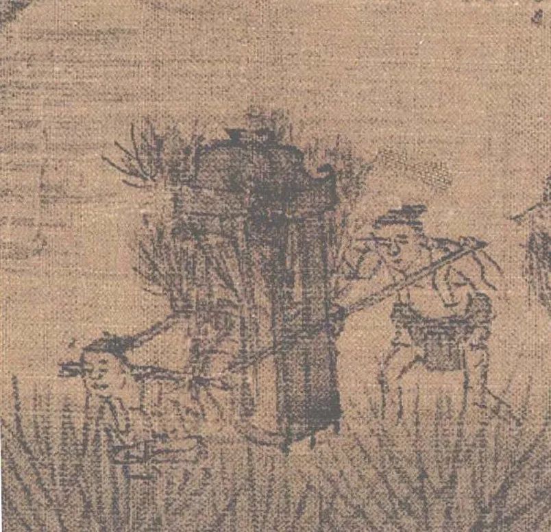 《清明上河图》中两名赤膊轿夫抬着插有柳枝的轿子。
