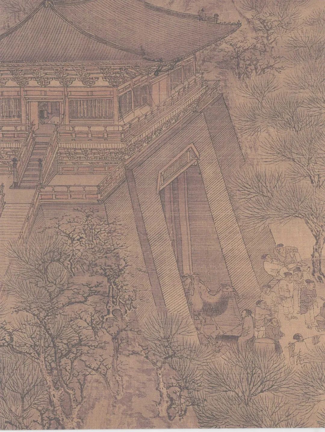 踢踏的蹄声和赶驴的吆喝声,从画卷的开首传来。抬眼看去,这真不是个分外明朗的好天气,薄雾萦绕在老树枝丫之间,但从树丛中走出的这几匹驴子和前面赶驴的行人,却为这稍显暗淡的天气,加了一笔活泼的亮色——他们是要走出画卷吗?还是走向被画心边界挡住的看不见的远方?——东京城外,诚然有着更广阔的天地。但对生活在那片更广阔的天地的芸芸众生来说,东京汴梁,才是天下的中心。