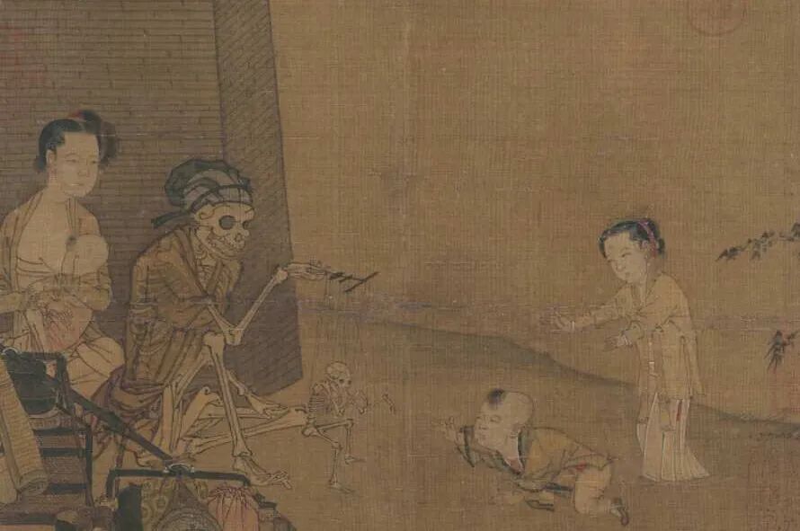 《骷髅幻戏图》局部,象征死亡的骷髅用牵线傀儡吸引小孩儿奔向死亡。