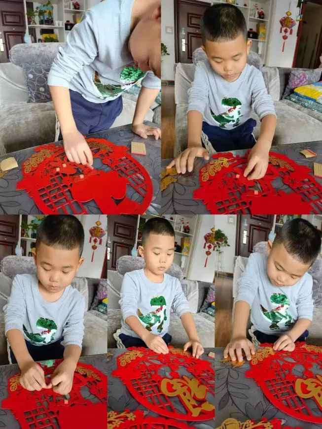 3.五六年级:与家人一起设计制作一份有年味的剪纸作品,把作品贴在A4纸上,跟自己的作品合影。