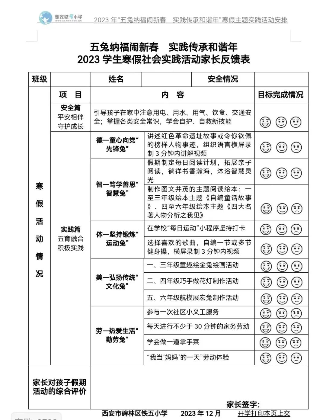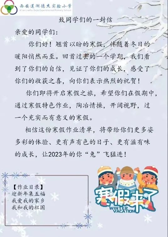 西安莲湖德杰实验小学的寒假实践作业分为“迎新年集五福”、“我爱我的家乡”、“我和我的祖国”三个版块。学校致力于用爱与责任浸润教育,把学生假期的学习生活、劳动技能以及地方特色、中华传统文化等内容完美地结合在一起,让学生度过一个健康、快乐、有意义的寒假。