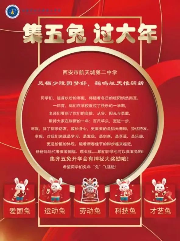 航天城第二中学的语数外作业实行分层设计,不同能力的学生可自主选择完成。其他学科特色作业,也由学生根据自己的喜好与实际情况选择完成,可以在作业“菜单”中选一项,也可以都完成。寒假作业以兔年元素为主题,同学们集“五兔”,寻“年味儿”,过“魅力寒假”。