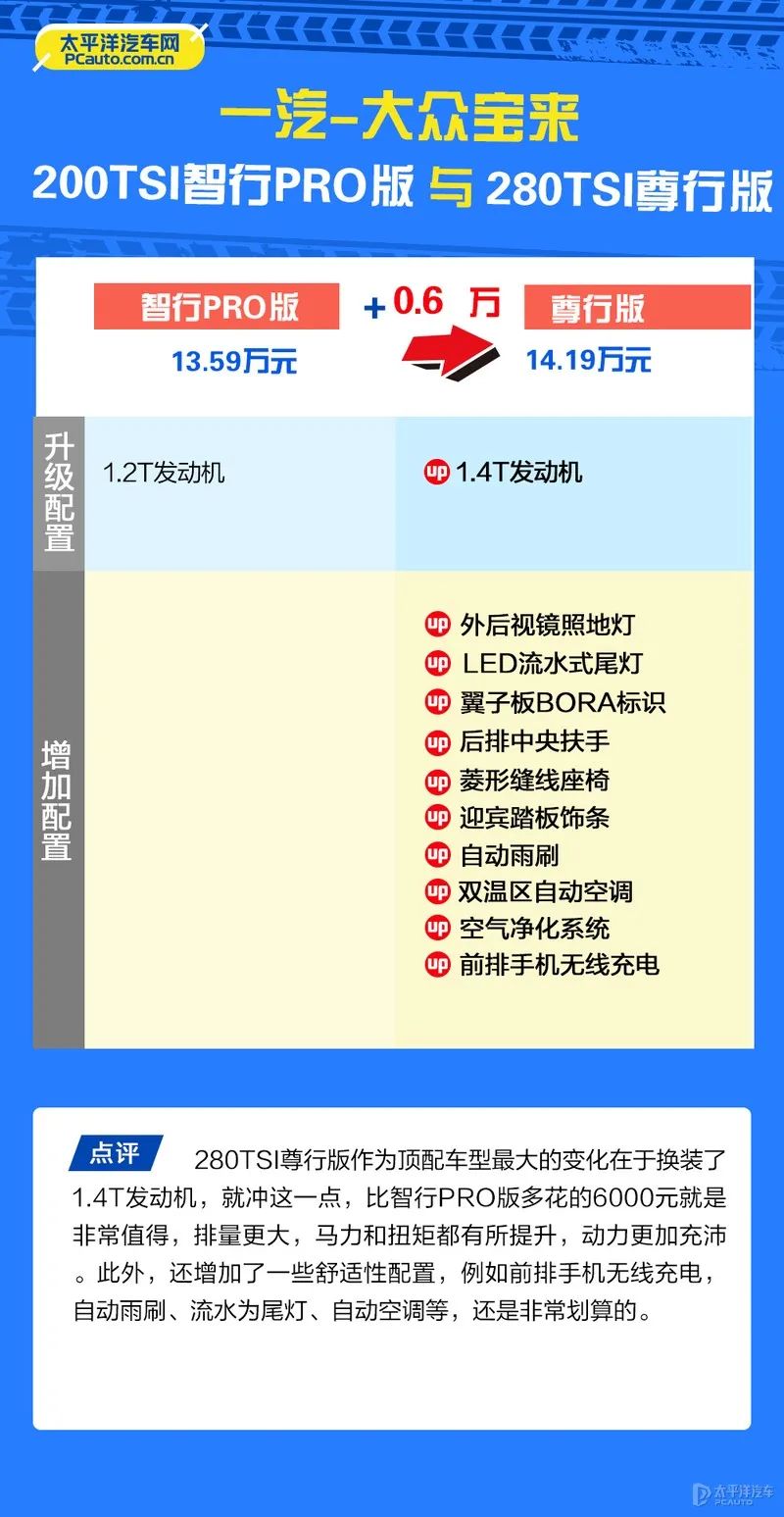 2022款一汽-大众宝来共有五款车型,其中四款搭载1.2T发动机,顶配车型搭载1.4T发动机,入门版本的车型搭载5速手动变速器,其余车型均搭载7速双离合变速器,配置方面,手动畅享版与自动畅享版配置完全相同,仅在变速器上有所区别,从自动智行版开始拥有ACC自适应巡航、全景天窗、内饰氛围灯、主动刹车等功能,而智行PRO版则是增加了全液晶仪表盘、电动座椅,以及一些安全方面的驾驶辅助系统。顶配车型不光是在外观上又特有的BORA标识,还有流水式的动态尾灯。