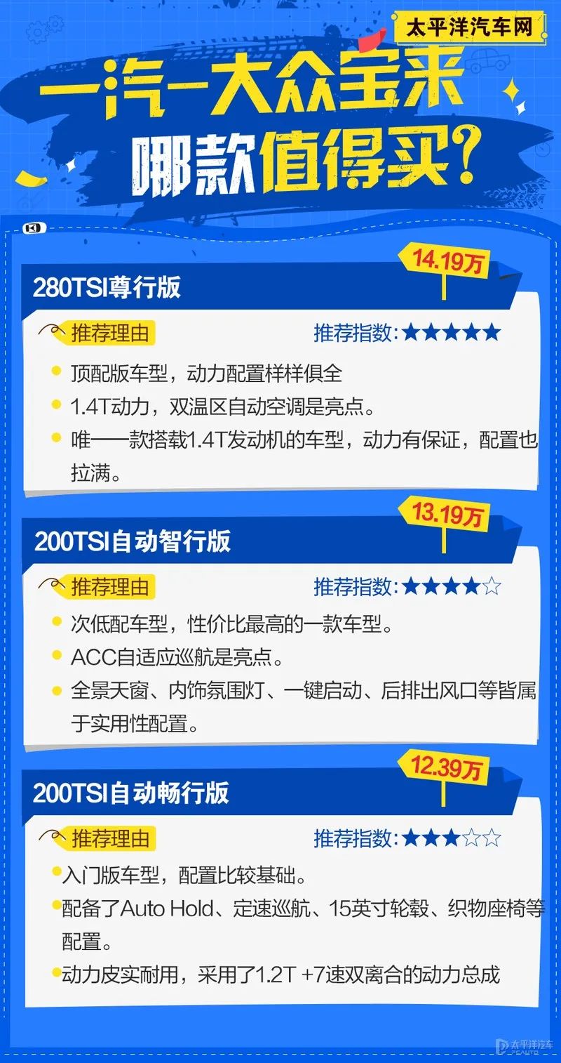 宝来作为A级车型的常青树,从当年的驾驶者之车逐渐演变成了今天的国民级家轿,报来的实力毋庸置疑,而今2022款宝来上市,带来了全新的外观内饰设计,并且取消了过去的1.5L自吸发动机,取而代之的则是1.2T发动机。总的来看,2022款宝来我最推荐的是顶配——280TSI尊行版,主要是因为只有这款车型搭载了1.4T发动机,动力完全能够得到保证,而如果你对动力没有要求的话,不放可以看看200TSI自动智行版,他也是整个车系中性价比最高的车型。
