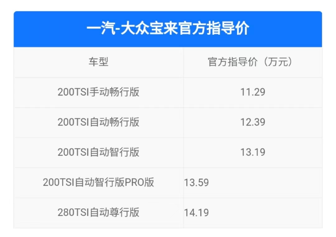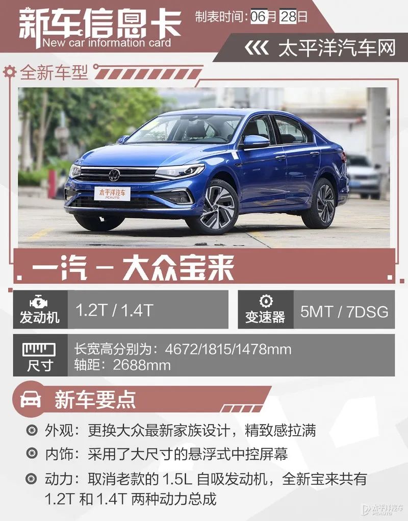 6月28日,2022款一汽-大众宝来正式上市,全系共有五个版本车型,售价11.29-14.19万元。新车最大的亮点在于取消了过去的1.5L自吸发动机,全系标配涡轮发动机,有1.2T、1.4T两种动力总成可以选择。