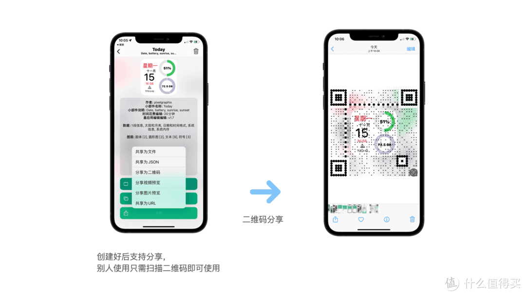 Widgy的强大之处在于自定义,可以完全按照自己的要求制定一个,包括大小、背景、显示内容、显示方式、颜色搭配等等,关于这个就能写一篇长文,喜欢折腾的可以自己研究一下,中文显示,不用担心。辛苦编辑好的小组件支持二维码分享,之后扫描二维码就能用了。