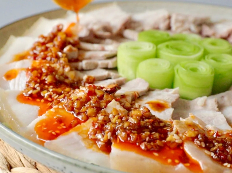 李庄白肉全名为“李庄刀口蒜泥白肉”,是四川宜宾李庄的传统美食,选用猪后腿将臀部去掉第一刀之后的部位,俗称"二刀肉"。李庄白肉对刀工要求较高,肉片切得长而薄,厚度在1~2毫米,摆盘讲究,料汁是用干的七星辣椒、花椒、大蒜一同舂成糊状,加进酱油和适量味精、白糖、麻油调制而成,集麻辣味和蒜香味一体,肥而不腻,回味无穷。