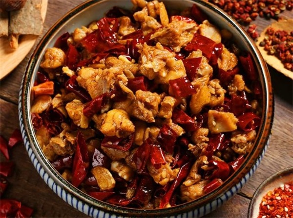 辣子鸡也是川菜馆必点的一道菜,鸡肉切成小块,用料酒、葱姜、盐、鸡精、味精腌制入味,锅中倒油烧热,下入鸡丁煸炒至鸡肉金黄较脆,接着另起锅放入葱姜蒜片、辣椒和花椒,再放入鸡丁,最后淋入生抽、鸡精、香油、藤椒油等调味。