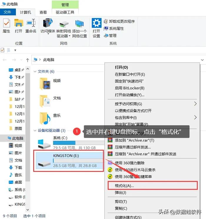 第1步:U盘与电脑连接成功,打开【此电脑】。找到U盘,鼠标右键点击它的图标,选择【格式化】;