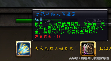 如上图,这个玩具的效果是让你获得一个buff,一小时内在潘达利亚钓鱼的时候有几率会有额外拾取,我的很多小伙伴都说用了这个之后搭配潘达利亚大鱼点,很容易钓起来海龟: