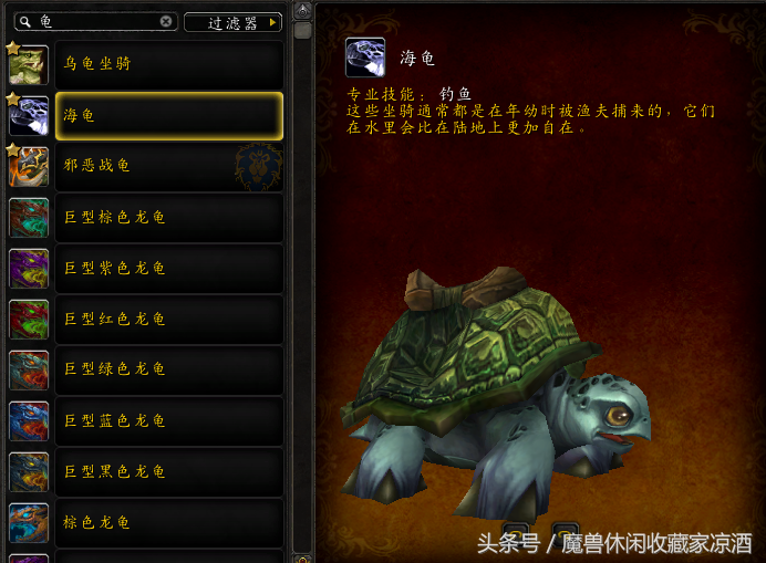 海龟和乌龟坐骑都是钓鱼钓起来的,海龟可以在诺森德版本地图、大地的裂变版本地图、熊猫人版本地图、德拉诺版本地图的任意水域钓起来,当然,几率很低,乌龟坐骑据说只有要塞三级钓鱼池塘能钓起来,凉酒这只是妙脆角CDK卡片换的,所以没有验证过。