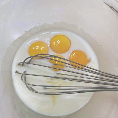 3、加入4个蛋黄(蛋清放在一个无油、无水的盆里备用)