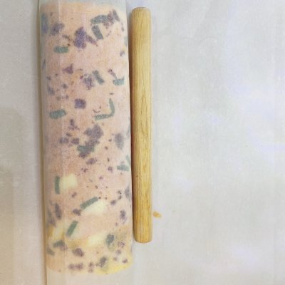23、卷好后用擀面杖顶着旁边放入冰箱冷藏定型