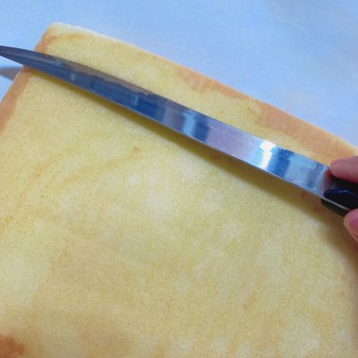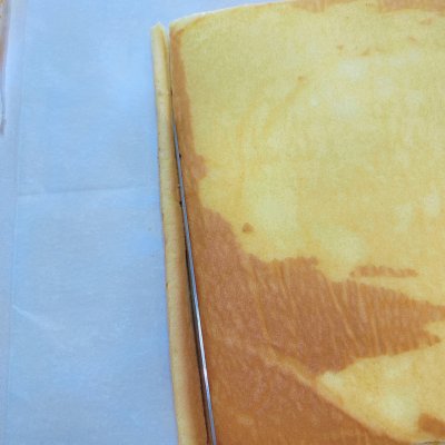 18、待到蛋糕微温不烫手时,用大的烘焙纸盖住翻面切去三边的边角