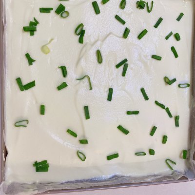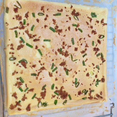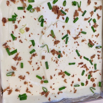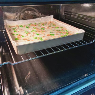 14、提起烤盘震几下去掉里面的大气泡,表面用刮刀抹平再撒上葱花