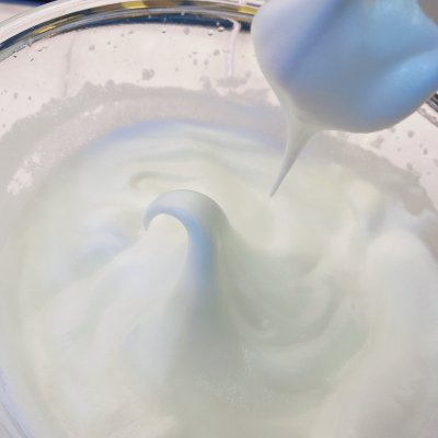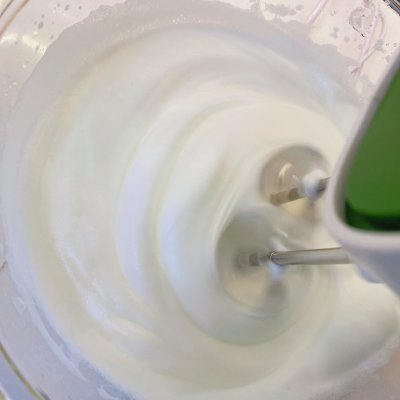 10、直至打到提起打蛋器蛋白霜能立起,但尾部有明显的弯钩,达到湿性发泡状态就可以了