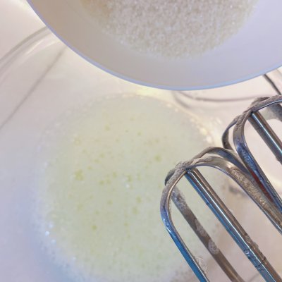6、用电动打蛋器中高速打发到大泡泡时加入1/3的糖(糖的量总共是50克)