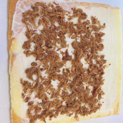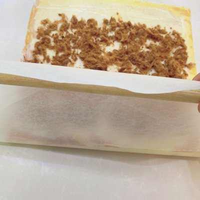 21、铺上肉松,上面斜切的收口处留一点不要铺肉松