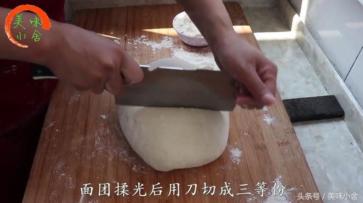 面团揉光后用刀切成三等份,蒸馒头的面必须得揉好,我这样反复的揉了大概有5-6次,最后用擀面杖把面团擀到薄厚均匀,然后在上面刷层油。大家也可以加些椒盐和辣椒面进去还有葱花,之前已经蒸了一锅椒盐花卷,所以今天就不加这些了