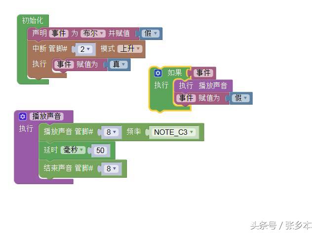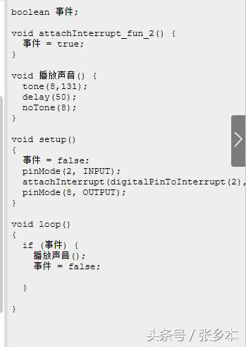 连接好硬件以后,下一步就是设计程序了。我们先来考虑一下,震动事件有没有发生,有两个状态,一个是发生了,一种状态下是没有发生,所以设定的变量时一个布尔值。其实很好理解,震动事件发生了,就执行播放声音,震动事件没有发生,就停止播放声音。其实在安防的过程中,震动报警器不能这样子制作的,必须有一个人去按动按钮,才能停止播放报警这个声音,待会我们再来描述,该怎么才能达到这个效果。下面给出模块程序以及Arduino 标准程序,Arduino 标准程序为了让更多的人能够使用Arduino平台开发出好玩的东西出来,绞尽脑汁降低门槛,它隐藏了程序的细节,是没有main函数这些的,使得开发者将注意力放在实现上。