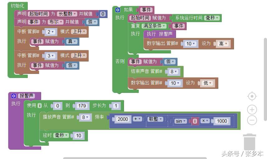 如果你想让报警声一直持续,在按了按钮后才停止,再加多一个按钮在三号管脚上面,初始化的时候,三号管脚处于上升状态,震动状态也给它赋值为假。不多说了,直接给出全部的程序。