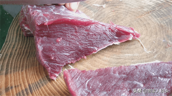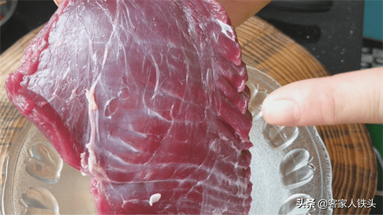 2、切牛肉片一定要逆着纹路切。