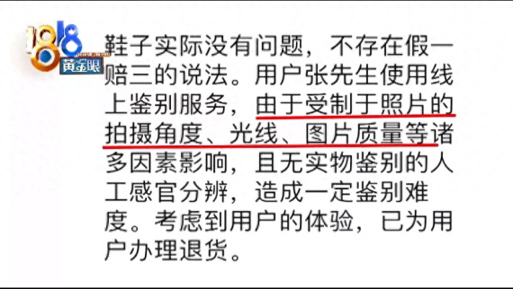 记者把情况反映给了“95分”公关部,之后工作人员发来文字回复,个别语句不太通顺,记者稍作整理,大概意思是说,鞋子没有问题,不存在假一赔三的说法,小张使用的线上鉴别服务,属于无实物鉴别,而且是靠人工感官分辨,受照片的拍摄角度、光线、图片质量等因素影响,鉴别存在一定难度,考虑到用户的体验,已为用户办理退货。记者再次联系小张,他说自己已经同意了退货处理,平台还返还了15元鉴定费。