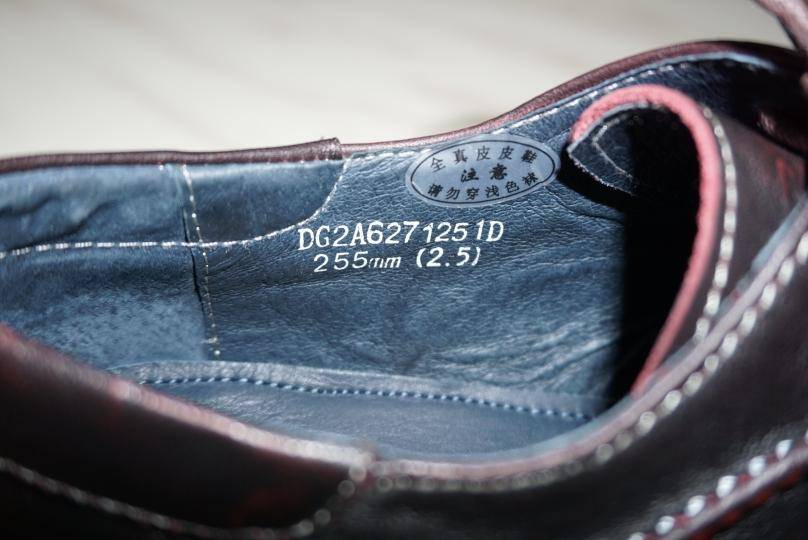 透气猪皮内里,开始还想着会不会捂脚,毕竟脚汗多,然而并没有,穿了几天下来,透气性很好,一点不闷。因为比较光滑,不会粘毛毛絮絮的东西,也容易清理。清晰标注了尺码255,习惯41码的我懵了3秒后,拿起之前的皮鞋看了下就搞定了。贴心的提示不要穿浅色袜子,可能也怕掉色吧,内里是靛青色,我穿的深色袜,没感觉掉色,哈哈