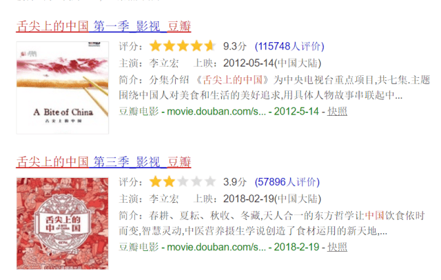 《舌尖》系列在第一季播出之时堪称惊艳,豆瓣评分更是飙到了9.3,但第三季的评分因重点的偏移严重下降。