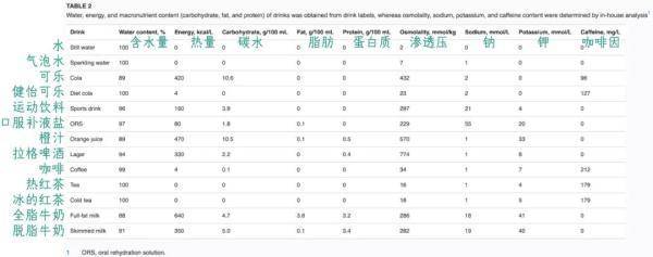 研究人员招募了 86 名受试者,测试了 13 种常见饮料(包括水、气泡水、可乐、健怡可乐、运动饮料、口服补液盐、橙汁、拉格啤酒、热红茶、冰镇红茶、咖啡、全脂牛奶和脱脂牛奶)对人体的补水效果。